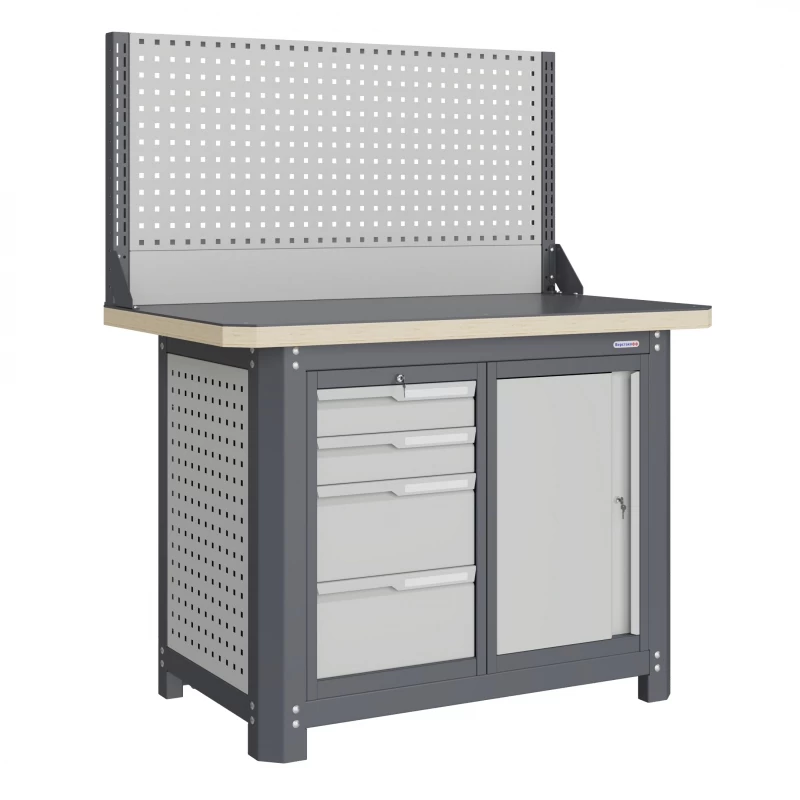 Модули верстака имеют сварную конструкцию из профилированной стали, каждый из которых запирается центральным ключевым замком.